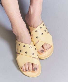 ひねりをきかせたクロスデザインと、スタッズ使いが新鮮なスライダーサンダル。