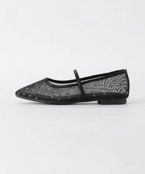 シアーなチュール素材にビジューパーツを施したフラットシューズ。