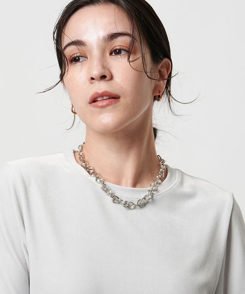 ネックレスを主役に、トップスはシンプルなカットソーとのコーディネートが今季らしく◎。
