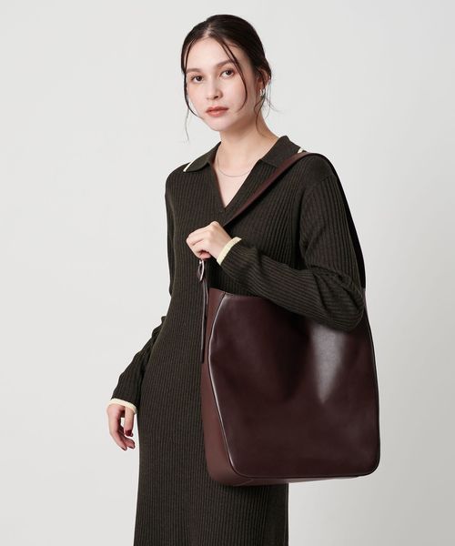 スクエア型のミニマルなルックスで洗練された印象のトートバッグ。