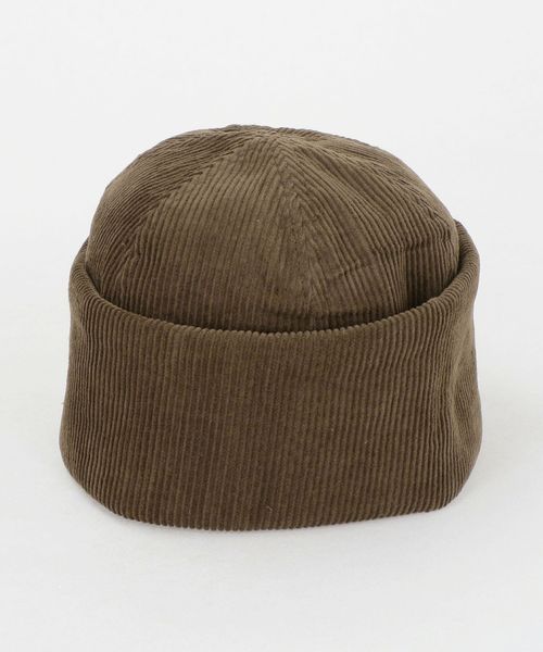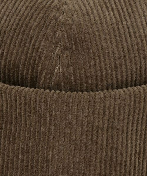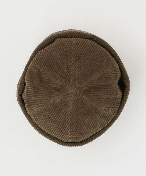秋冬らしいコーデュロイで作製した、深めの折り返しが特徴的なロシア帽風デザイン。