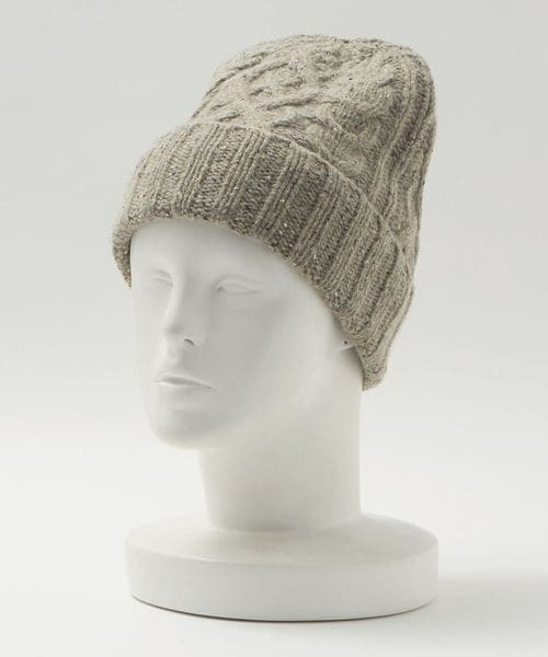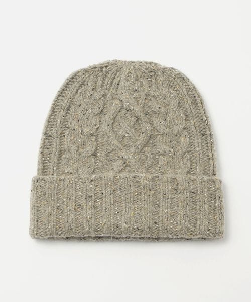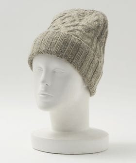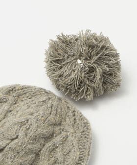 カラーネップ素材を使用し、ケーブル編みで仕上げたポンポンがアクセントのニットキャップ。