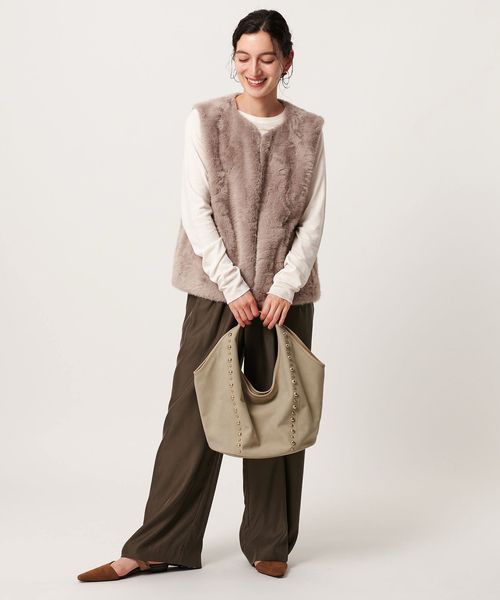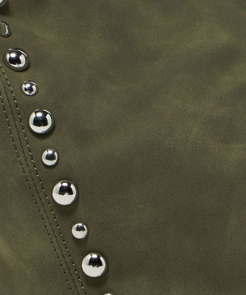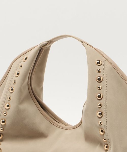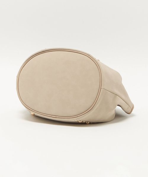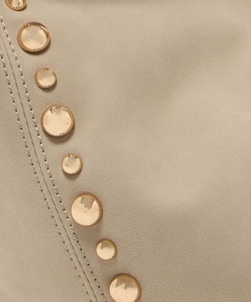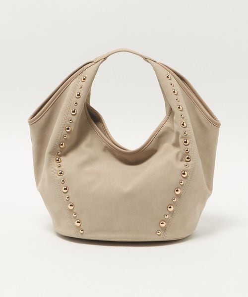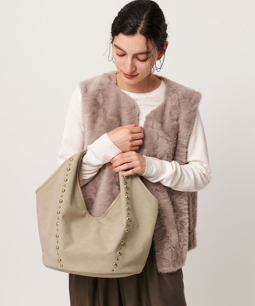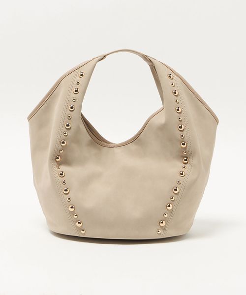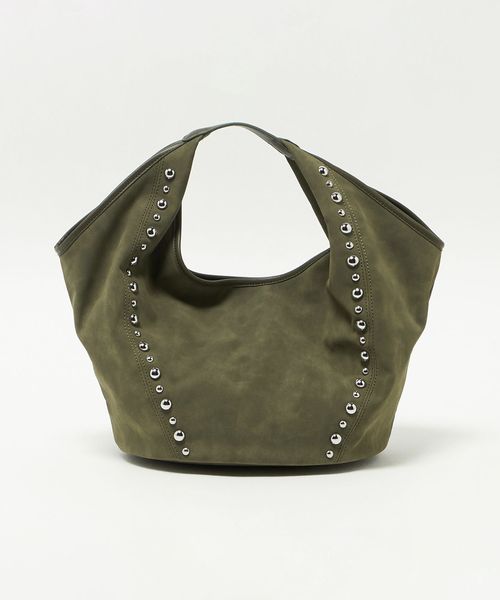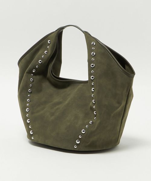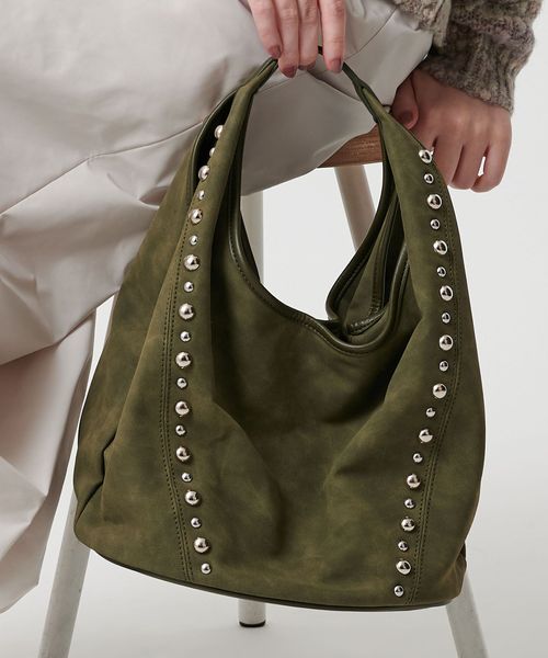 ヌバック調の合成皮革に、スタッズをアクセント的に配したデザインが新鮮なバッグ。