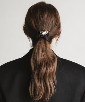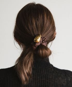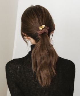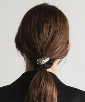 髪を結くだけで大人上品さを演出するシュシュは、丸みのある金属がナイロンの生地感やボリュームとのコントラストとなり、様々なファッションシーンでご活用いただけます。