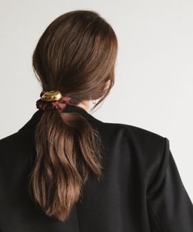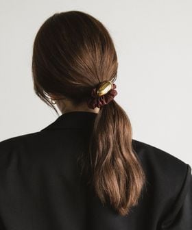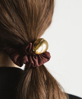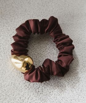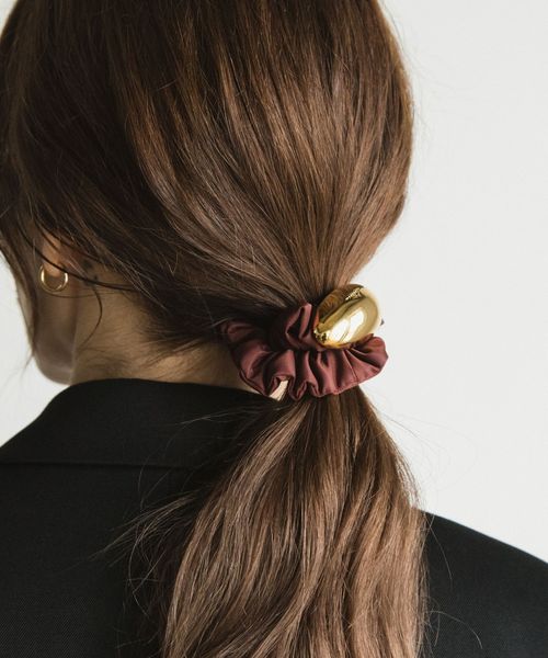 髪を結くだけで大人上品さを演出するシュシュは、丸みのある金属がナイロンの生地感やボリュームとのコントラストとなり、様々なファッションシーンでご活用いただけます。