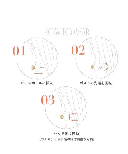 キャッチを必要とせず、フリップしたポスト部分をスライドすることで自由に締め付け具合を調整することができる、今までにない画期的な構造のピアス。