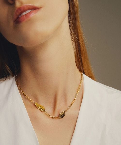 ほどよいチェーンの太さに大小のパーツが配され、ネックラインを印象的に演出します。