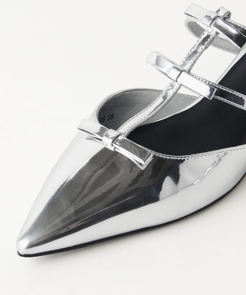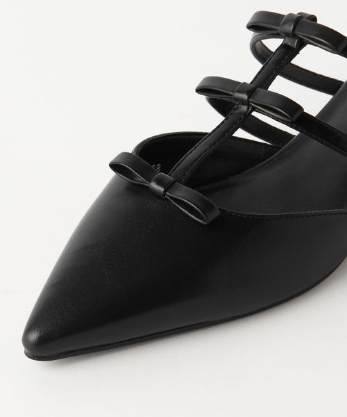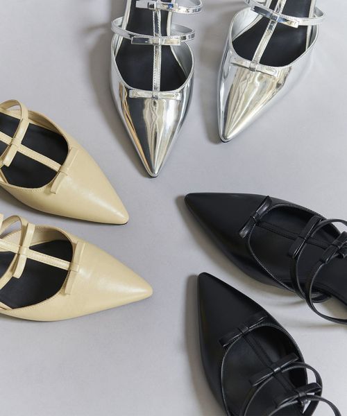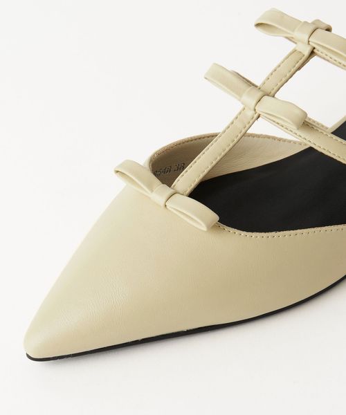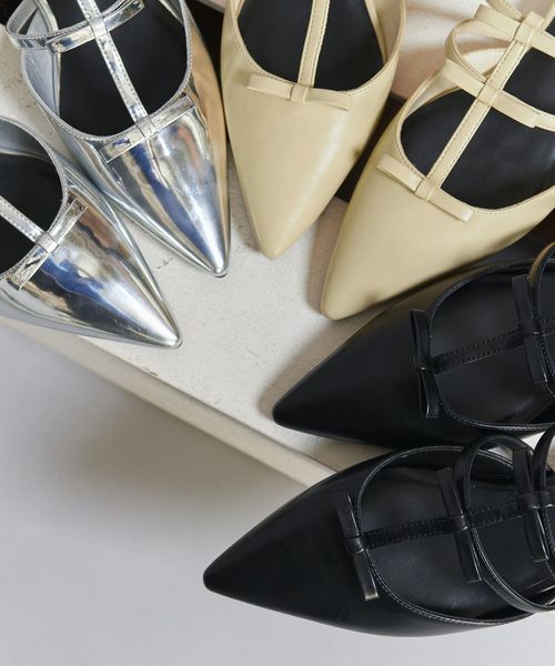 アッパーのラインに添った控えめなリボンモチーフとポインテッドトゥのデザインが新鮮な一足。