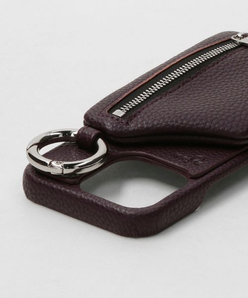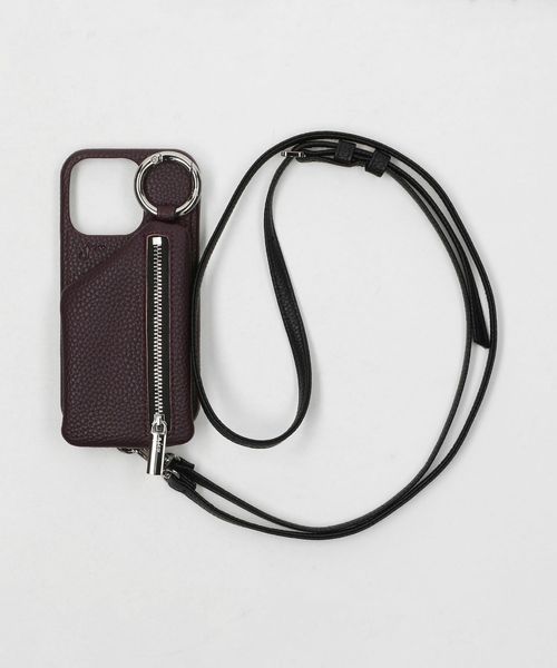<ajew>の定番ケース"ajew cadenas zipphone case shoulder"は、シルバーカラーのリングとファスナーポケットが象徴的な定番モデル。