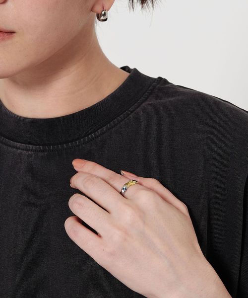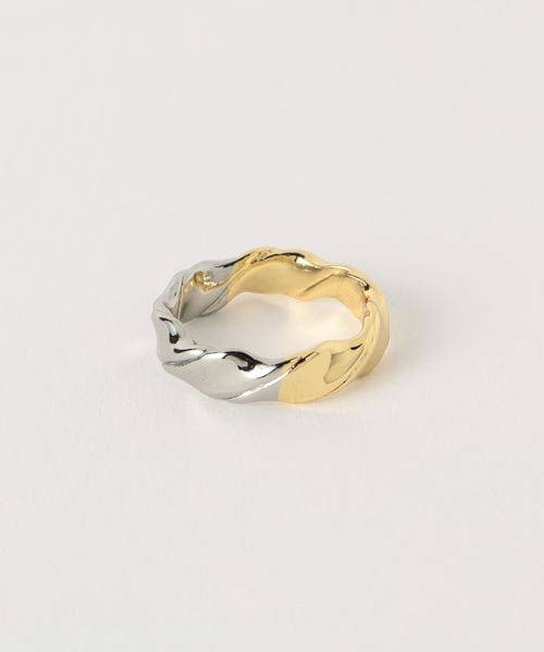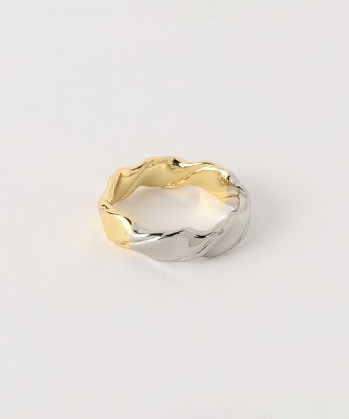シルバーカラーとゴールドカラーの2色を配し、ひねったようなシルエットが印象的なリング。