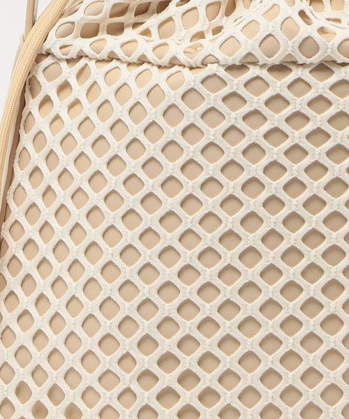 合成皮革の持ち手にメッシュの巾着バッグを組み合わせたデザインが新鮮な新作バッグ。