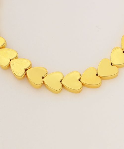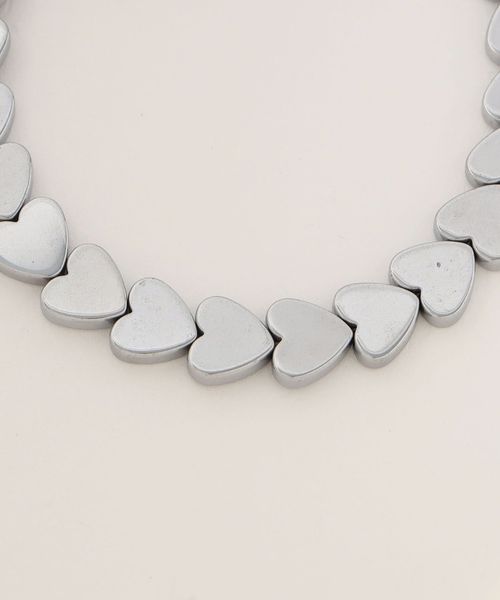 ヘマタイトにメッキ加工を施したハートモチーフを連ねた存在感のあるデザイン。