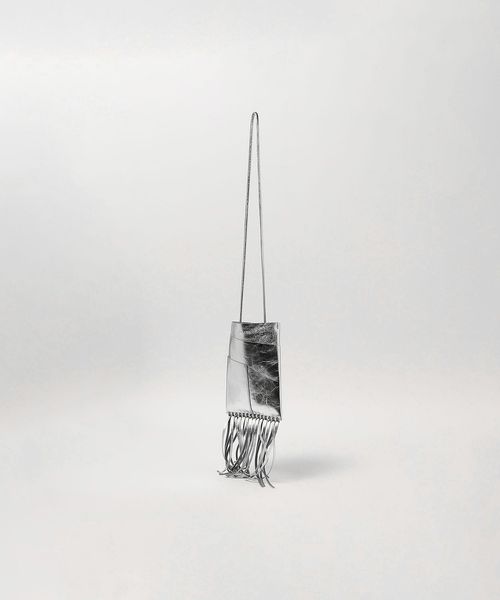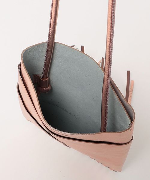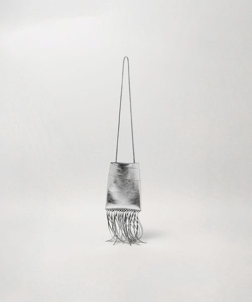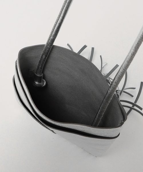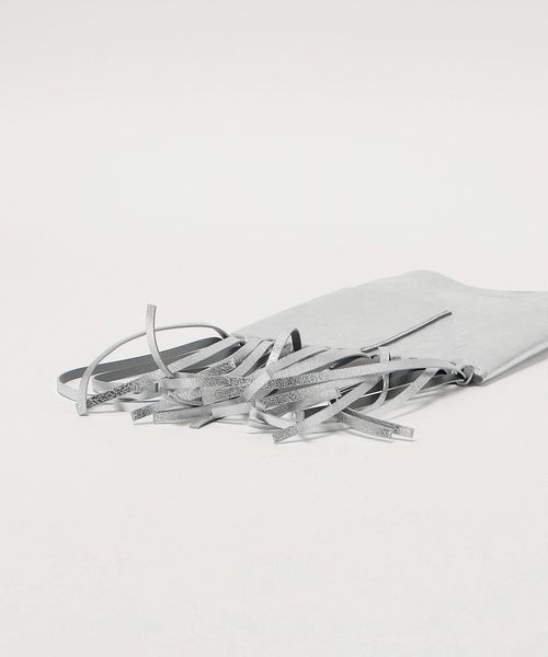 メタリックカラーでレザーを使用したシンプルな本体にフリンジをプラスしたデザインが新鮮なバッグ。