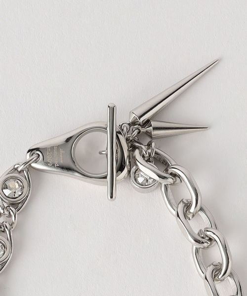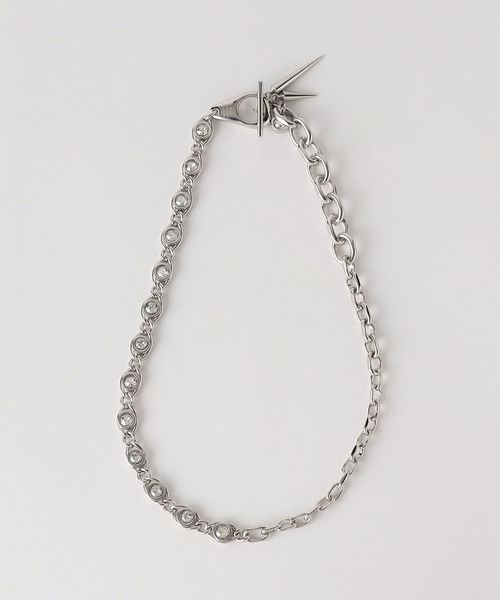 一粒モチーフを連ねた部分と太めのチェーンを繋げたデザインは、コーディネートにモードな華やかさを加えてくれます。