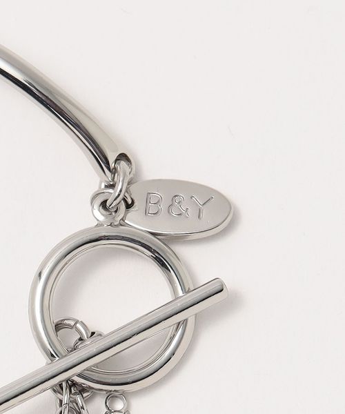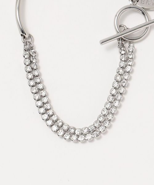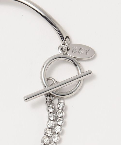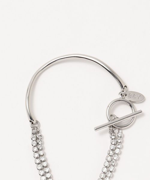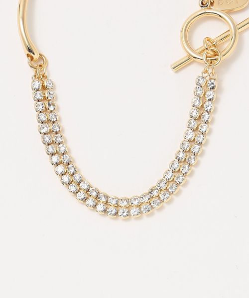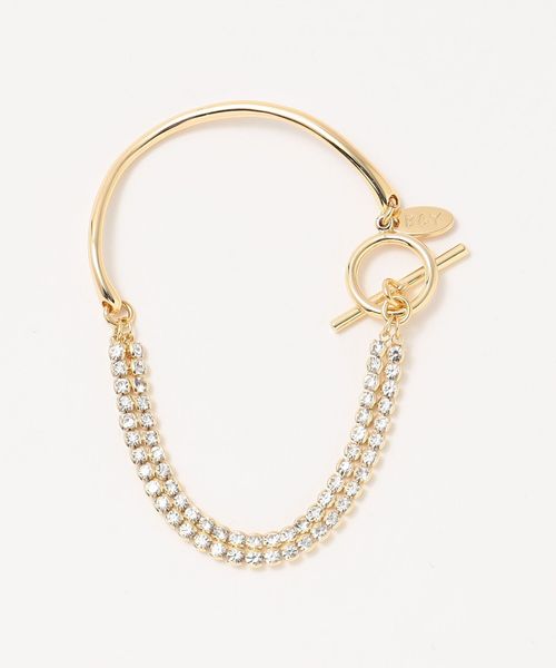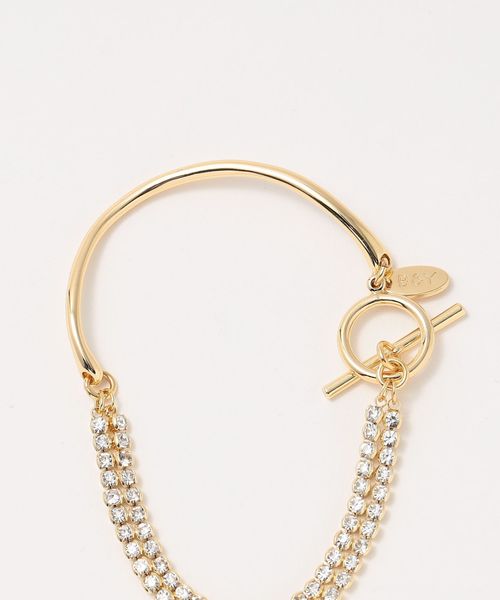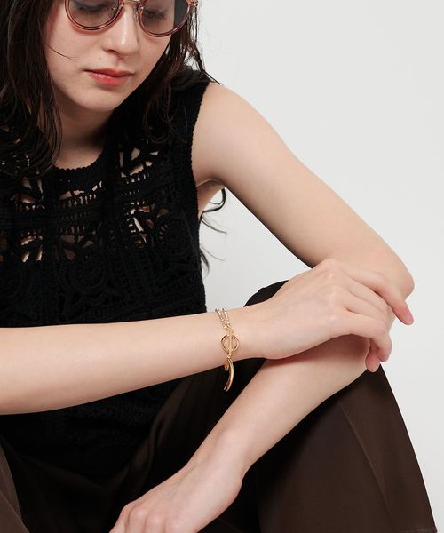 ガラスの小さな石を連ねたチェーンに、曲線的なシルエットのメタルパーツを組み合わせたブレスレット。