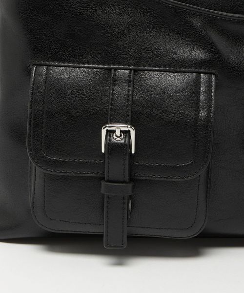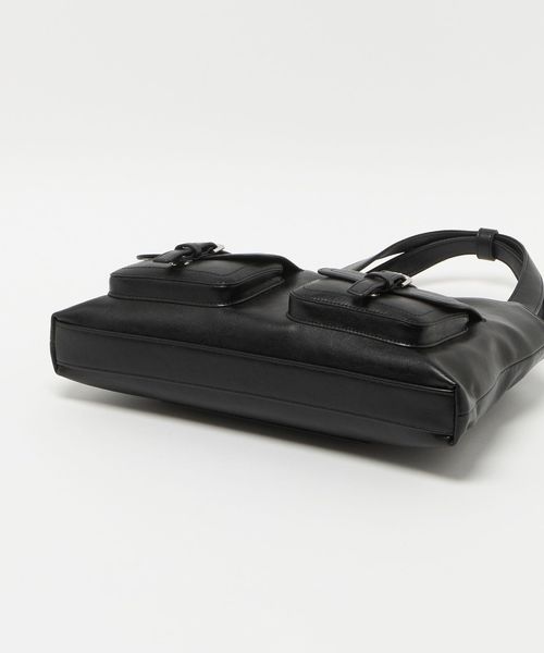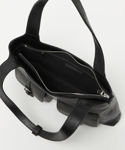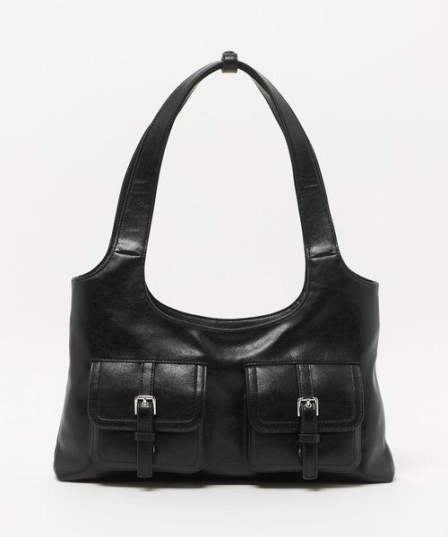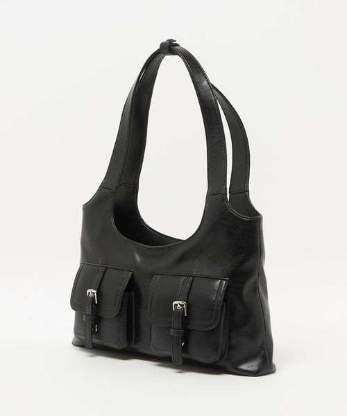 フラットなシルエットとポケットデザインが特徴的なショルダーバッグ。