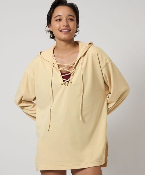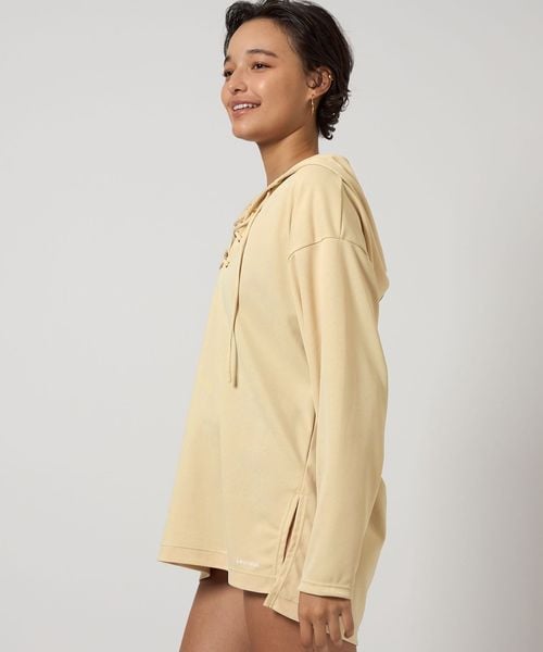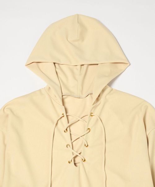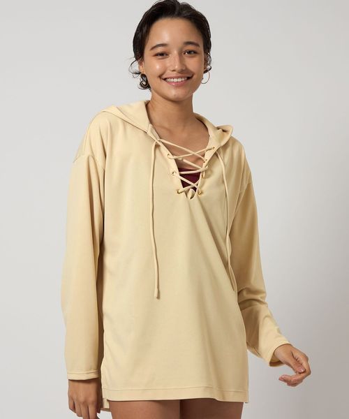 大きめのフードとフロントのレースアップデザインが特徴のラッシュガードのクリームカラー。