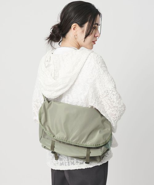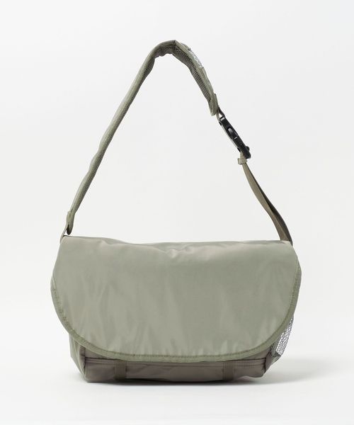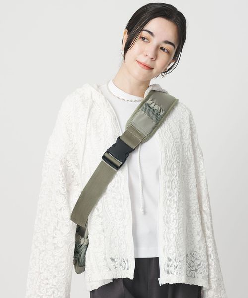 厚みのある太めのショルダー部分にはイヤフォンなどを収納できる小さなポケットを、ボディのサイド部分には中身を一目で確認できるメッシュポケットを備えた仕様。