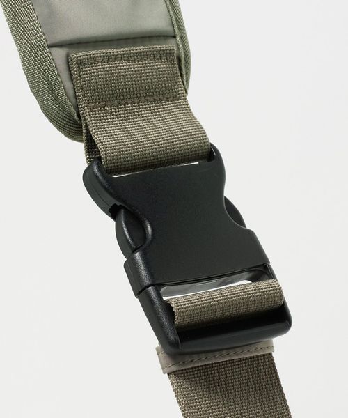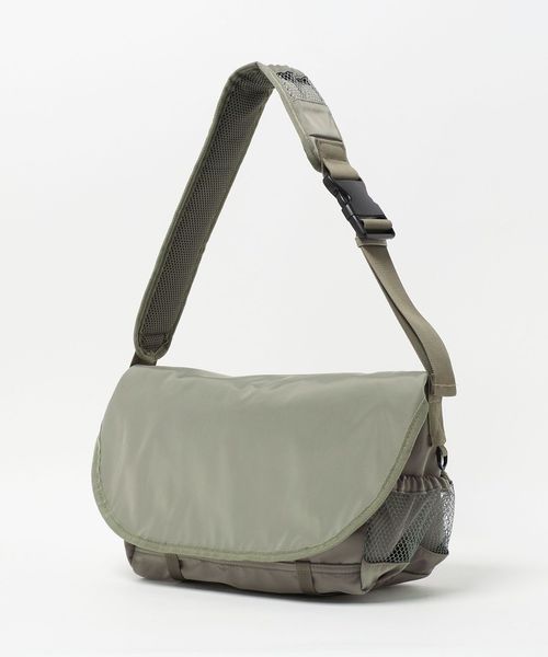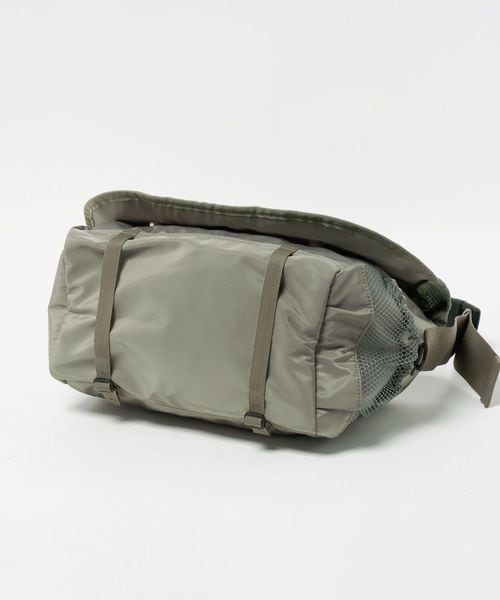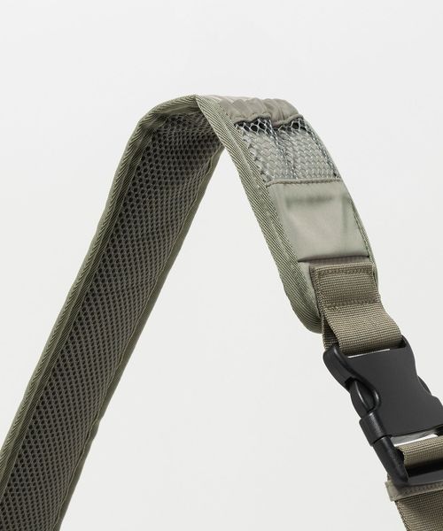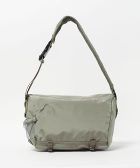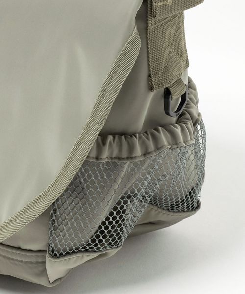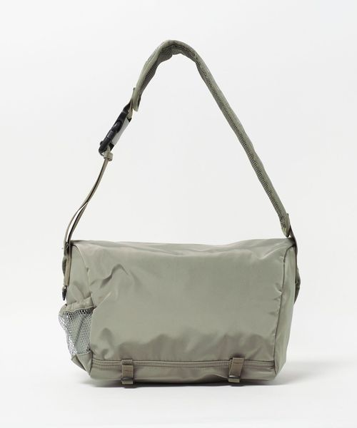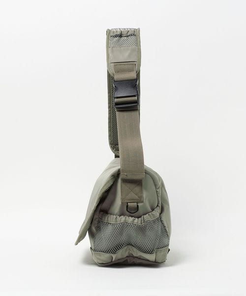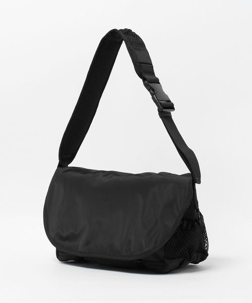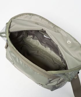 厚みのある太めのショルダー部分にはイヤフォンなどを収納できる小さなポケットを、ボディのサイド部分には中身を一目で確認できるメッシュポケットを備えた仕様。