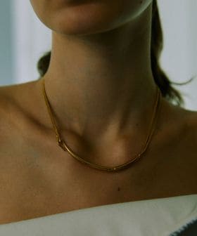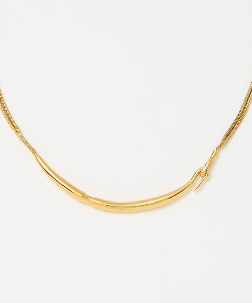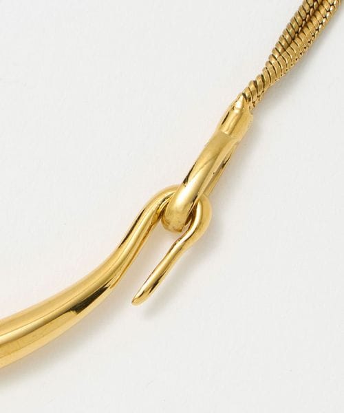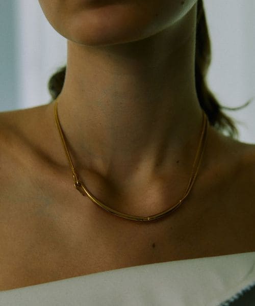 2連のスネークチェーンで独特の輝きを持つアイテムは、ネックラインで存在感を放ちます。