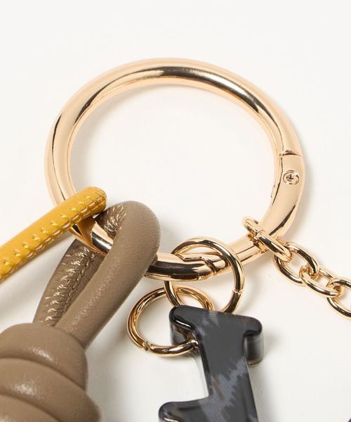 オリジナルのブランドロゴ入りパーツが付いた、カラフルで遊び心のあるバッグチャーム。