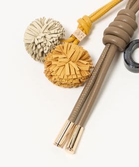 ポンポンモチーフやレザー調コード、小ぶりなハートチャームを組み合わせた存在感のあるルックスで、いつものバッグにアクセントをプラスします。