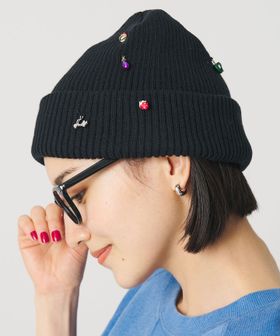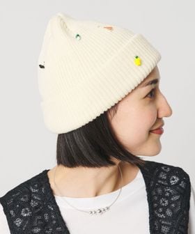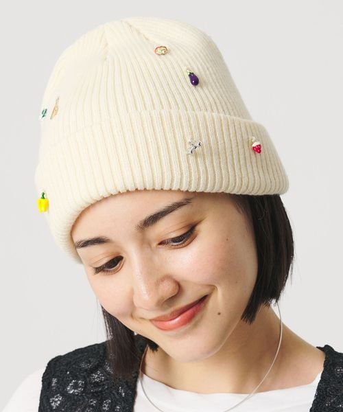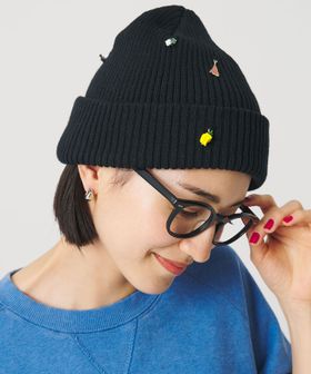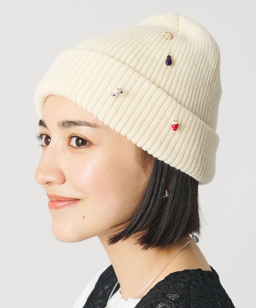 リブ編みのシンプルなニットキャップに、おもちゃのような小さなチャームを散りばめています。