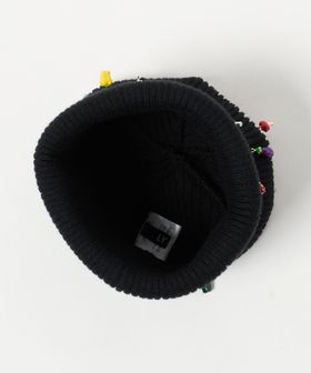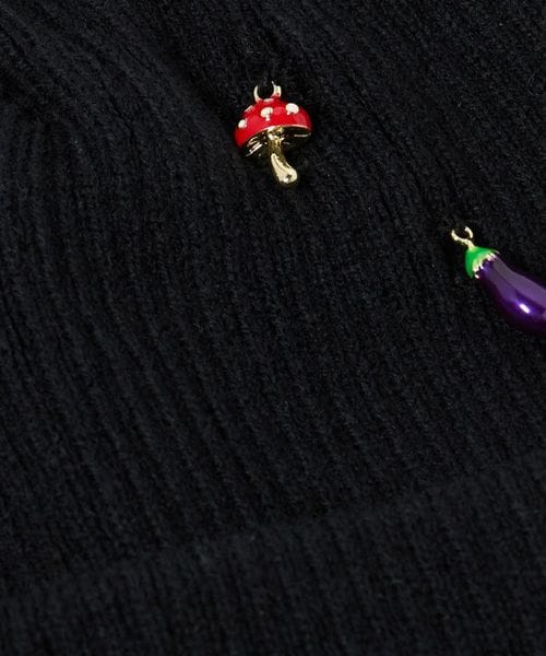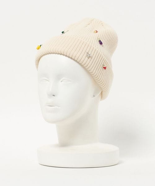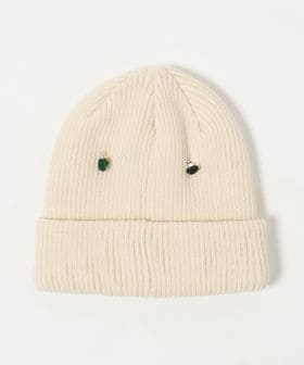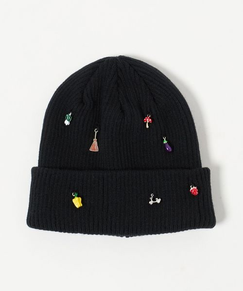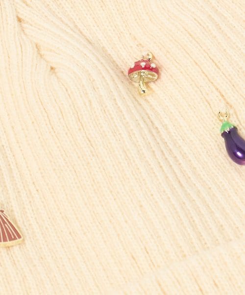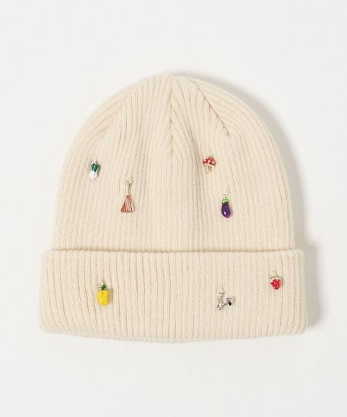 リブ編みのシンプルなニットキャップに、おもちゃのような小さなチャームを散りばめています。