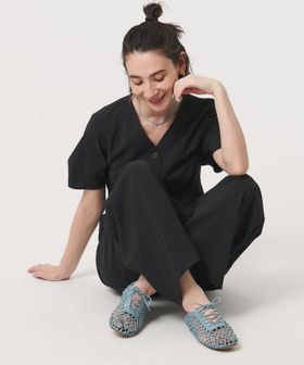 適度な透け感が魅力のシューズは、カジュアルなワイドパンツやデニムと好バランス。