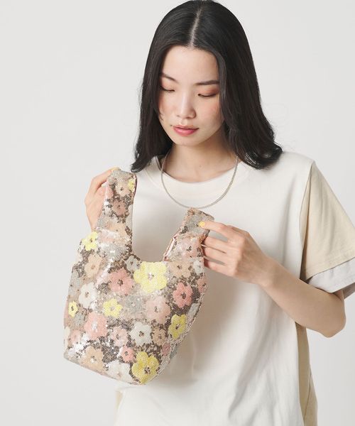 パステルカラーの花柄スパンコールが印象的な、軽やかなショッパー型ミニバッグ。