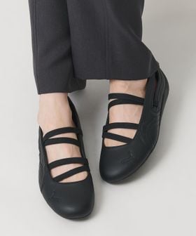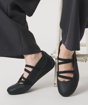 甲の部分を大胆にカットしたアッパーに、刺繍のブランドロゴ、ぴったりとフィットするゴムバンドが特徴です。