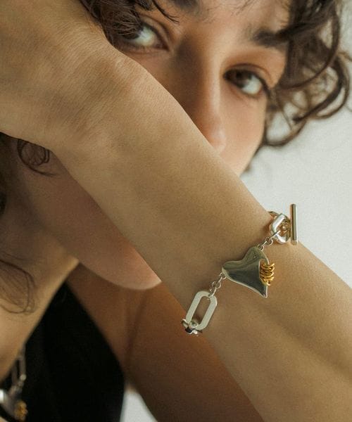 甘さ控えめのハートモチーフに、ボリュームのあるチェーンが印象的なブレスレット。