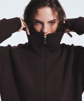 特徴的な高めのネックを活かし、閉めて着用することでトップス感覚で楽しめます。