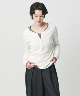 ミニマルなヘンリーネックが、落ち着いた印象を添えるロングスリーブカットソー。