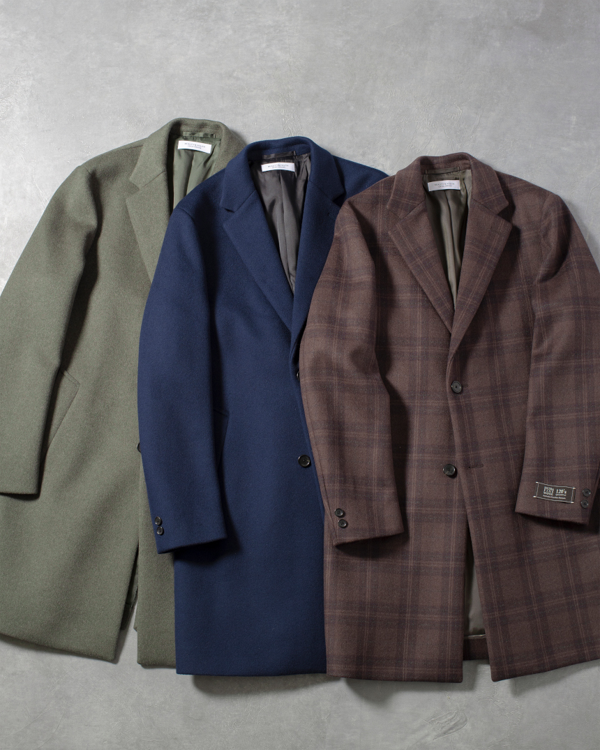 スーパー120Sの原料をふんだんに使用した、上質なチェスターコート。生地から別注作成し重織りメルトンで(ウール混率表記の全てに対してスーパー120原料を使用)