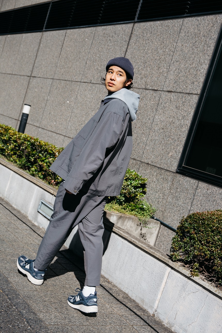 ブルーグレーを筆頭にありそうであまり無い、どこか曖昧なトーンで展開するイージーパンツ。素材はカバーオール同様、細かいシボ感とハリのあるコットンナイロンで、見た目も穿き心地も軽やかです。