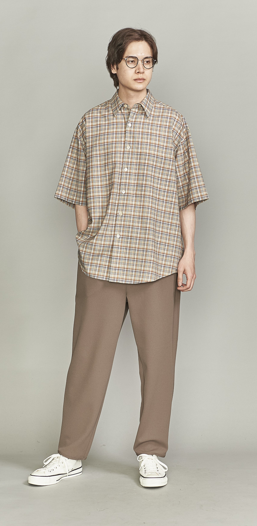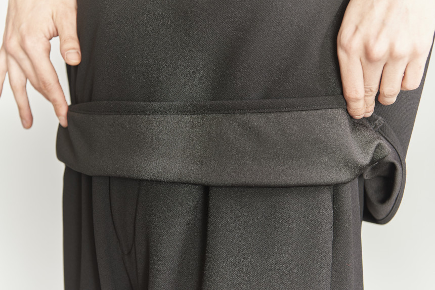 全アイテムのシルエット共通して適度なルーズさをもつリラックスシルエット。トップスは肩、胸回りはゆったりとしたワイドシルエットで裾をボディの共生地でパイピングすることにより適度な丸みと纏まりあるシルエットに仕上げています。