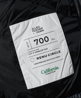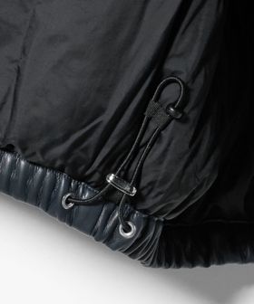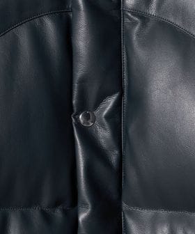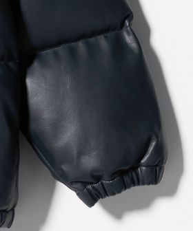 表生地は合成皮革、中綿にはアライド社のリサイクルダウンを使用したダウンジャケット。
