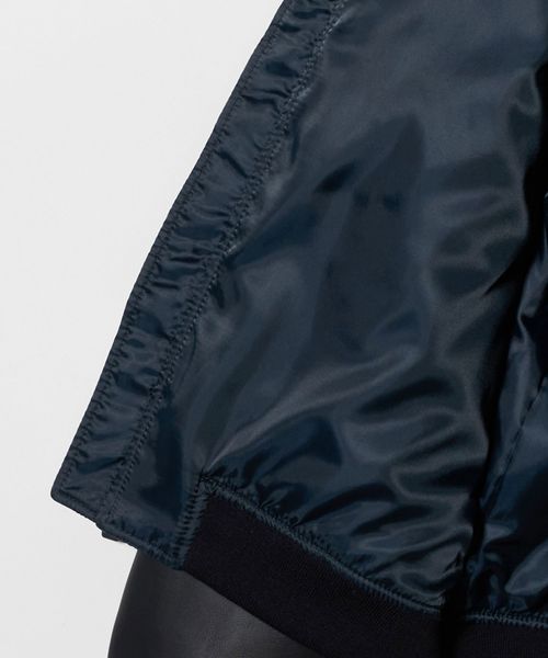 裏地にはネイビーのポリエステル素材を合わせ、表地とのトーンを揃えることで、統一感のある都会的なムードへと仕上げました。