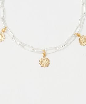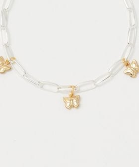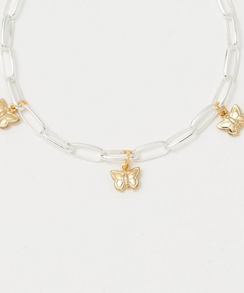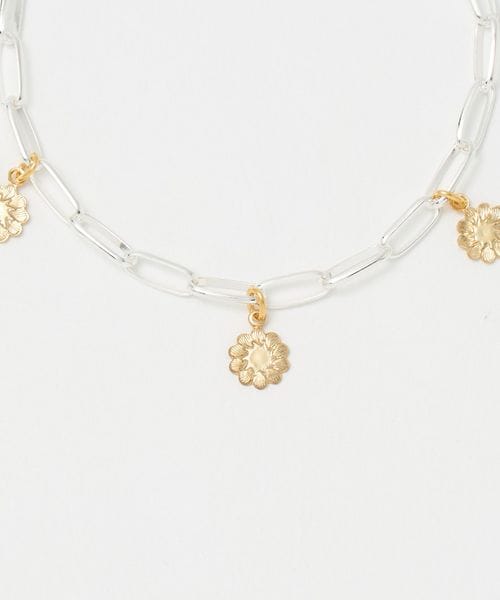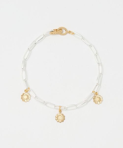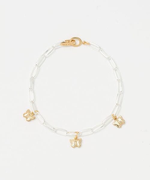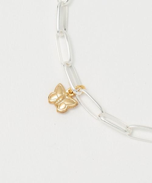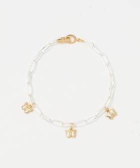 直線的なパーツで構成されたシャープなチェーンに、花や蝶モチーフのフェミニンなチャームを添えたブレスレット。