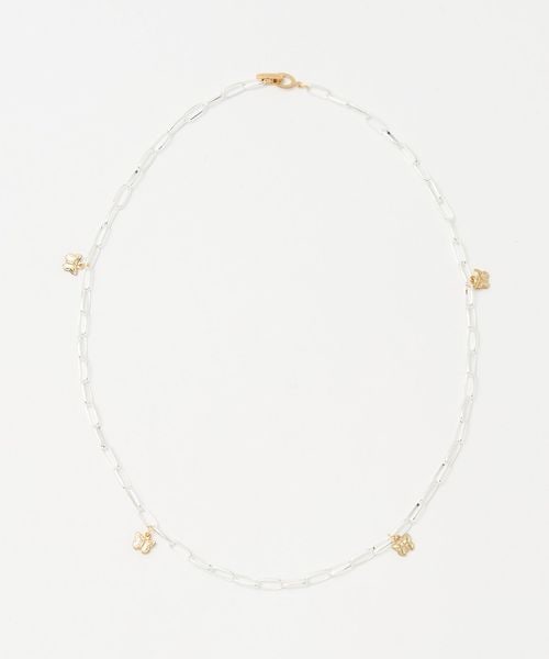 直線的なパーツで構成されたシャープなチェーンに、花や蝶モチーフのフェミニンなチャームを添えたネックレス。