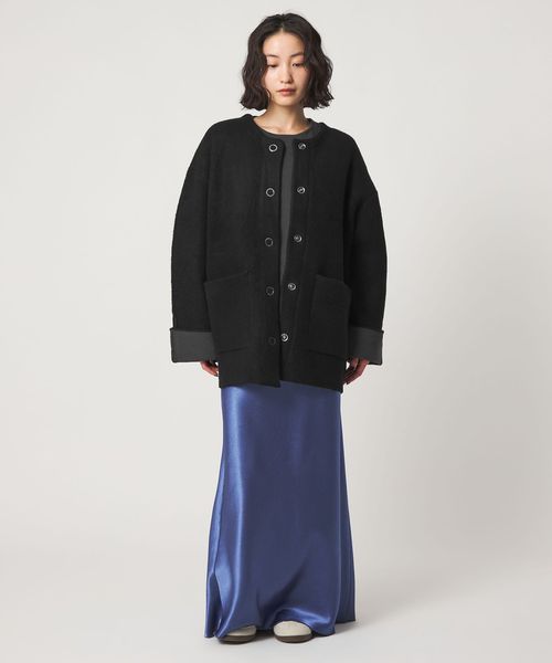 カーディガン感覚で簡単に羽織れ、程良いゆとりがあり中にも着こめます。