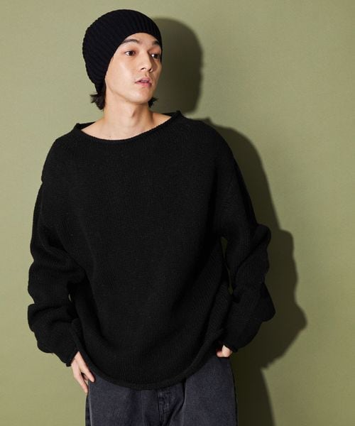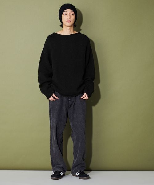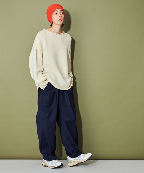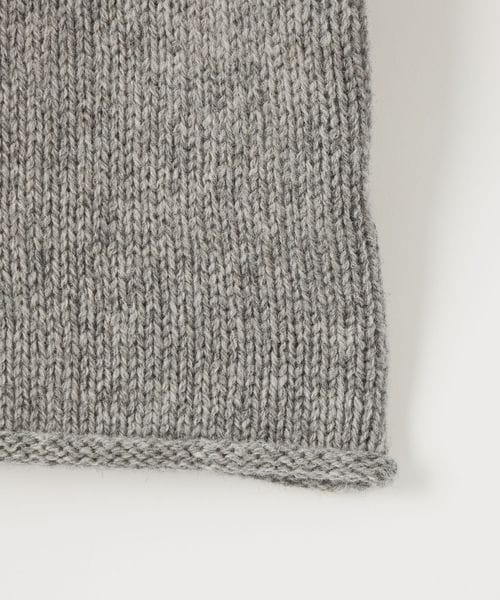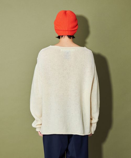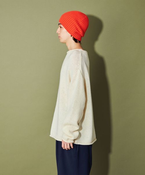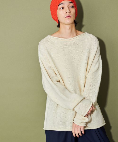 ウール糸を活かしたざっくりとした編地が際立つアイテムは、首元と袖はあえて緩くし大人が着れるリラックスシルエットを意識しました。