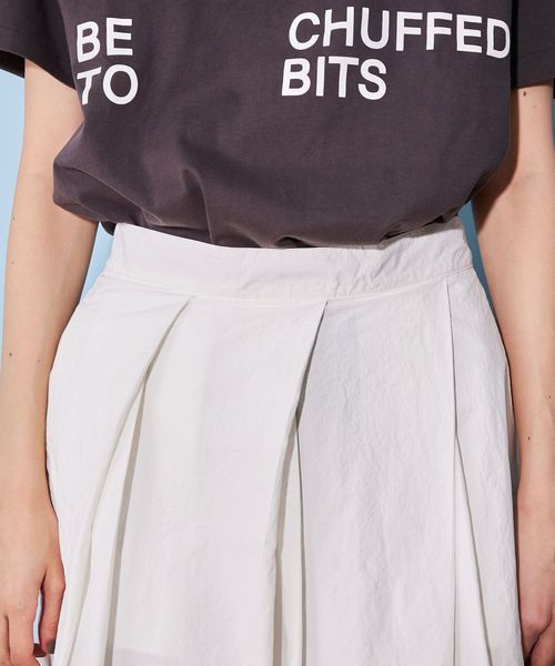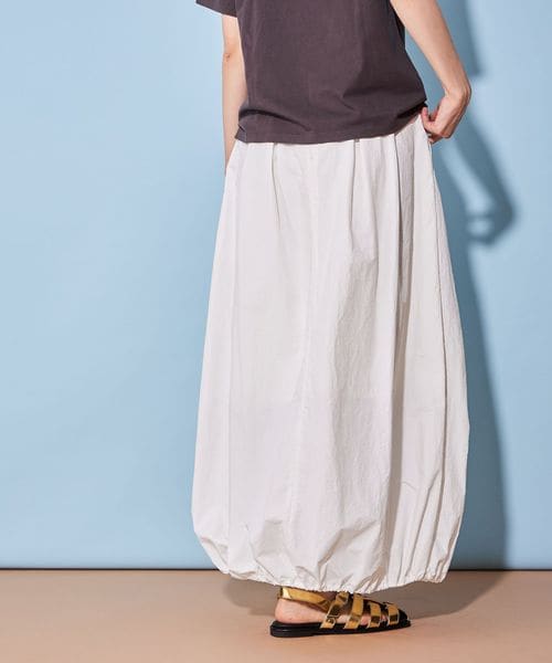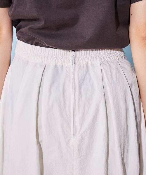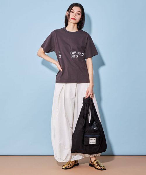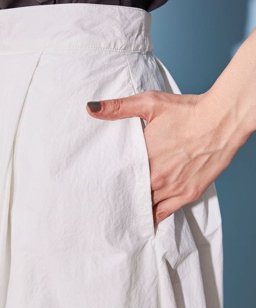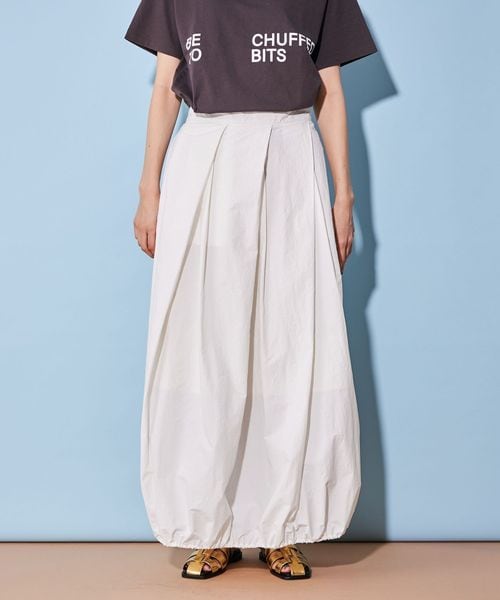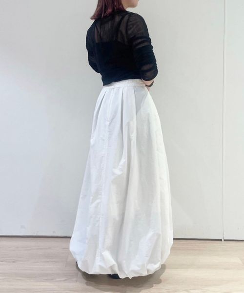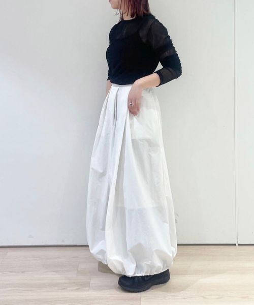 スカートのデザインをいかして、トップスはショート丈のコンパクトなサイズ感のアイテムや、ウエストインのスタイリングがおすすめ。
