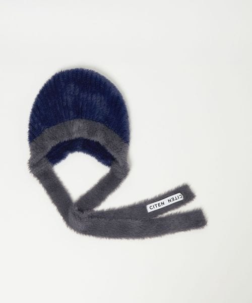 毛足が長くふわふわとした柔らかい質感のシャギー素材を使用して編み立てた細マフラー付きのニットキャップ。