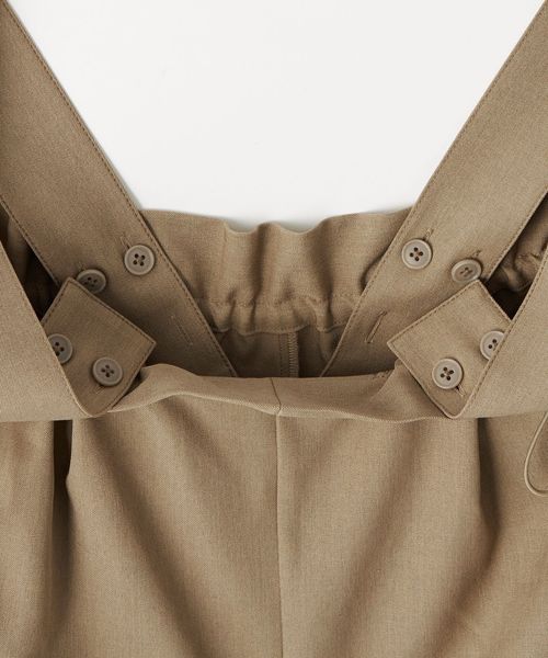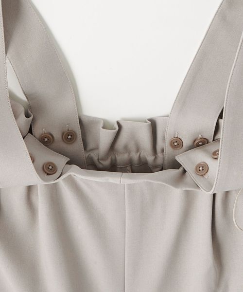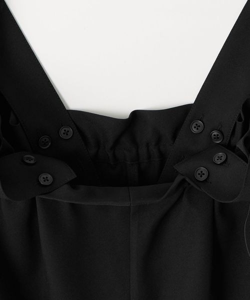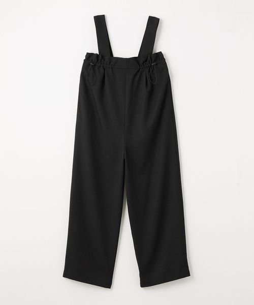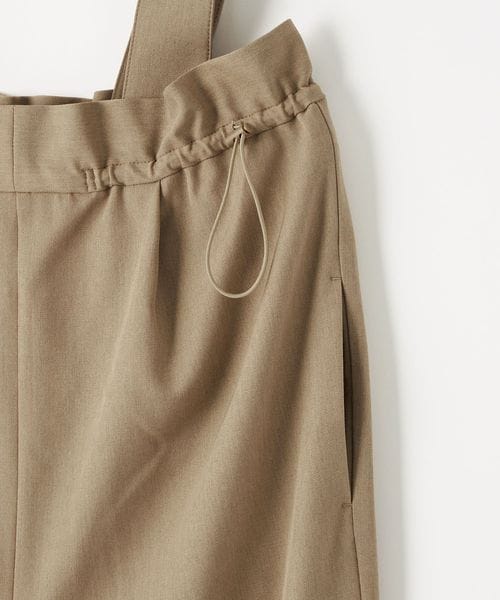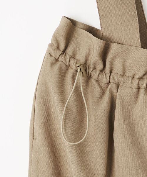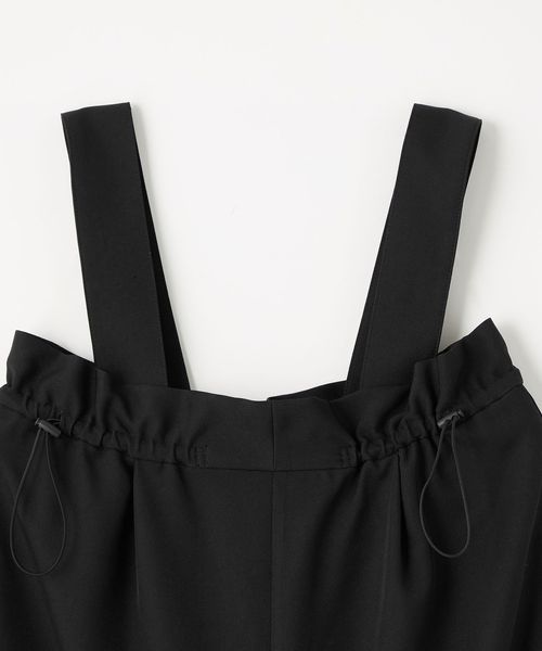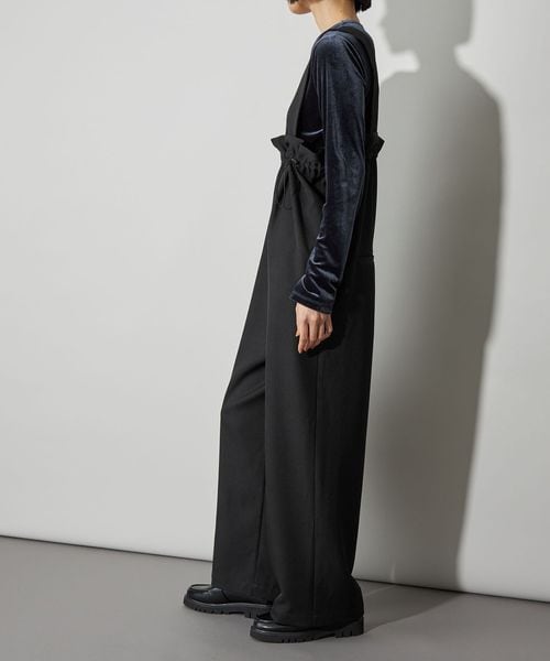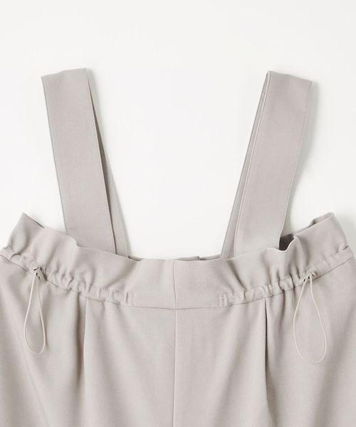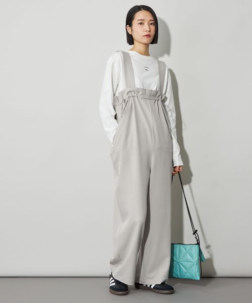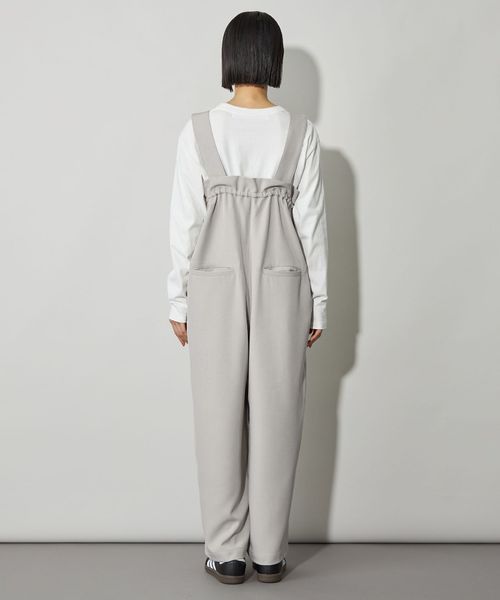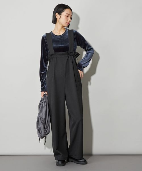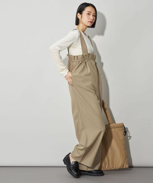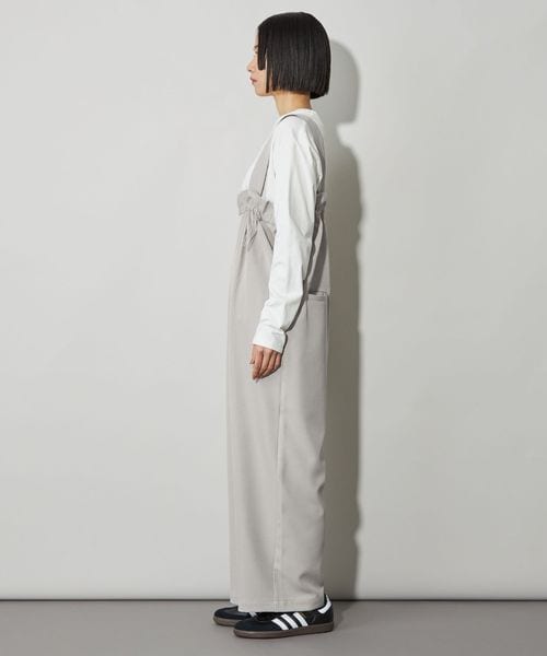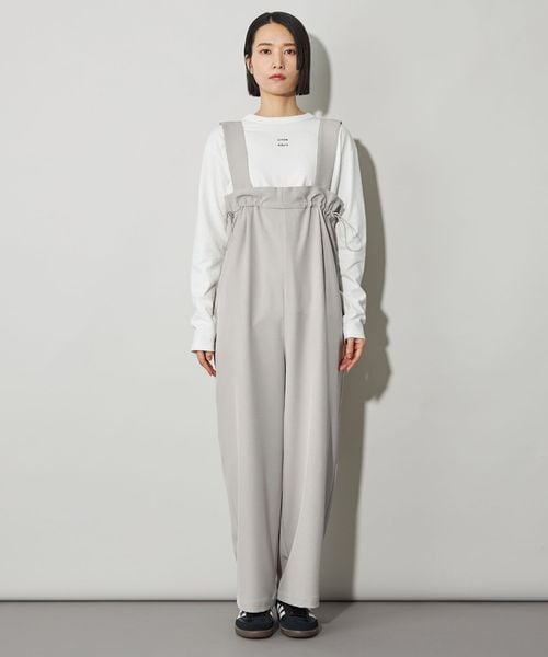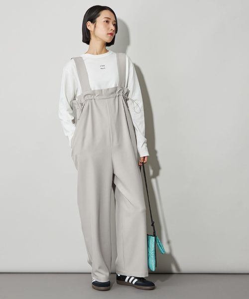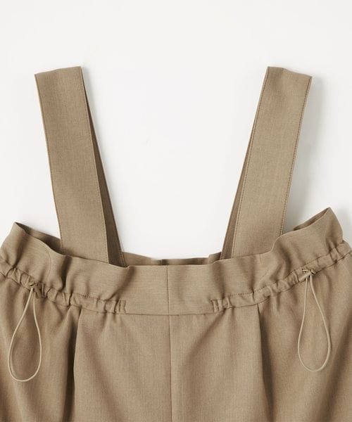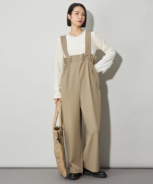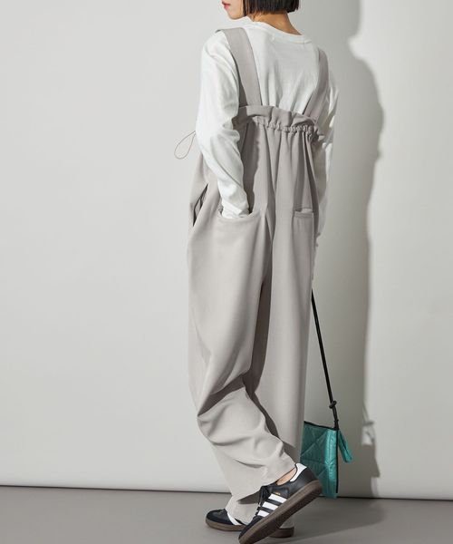 胸元のドローコードを絞る事よって、すっきりとした印象で着用できるオールインワン。