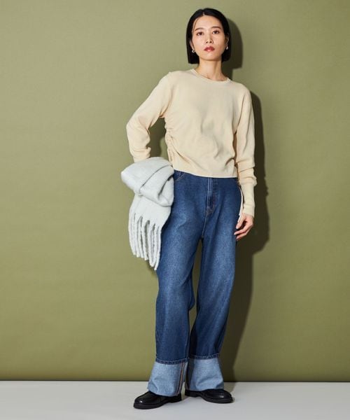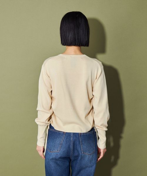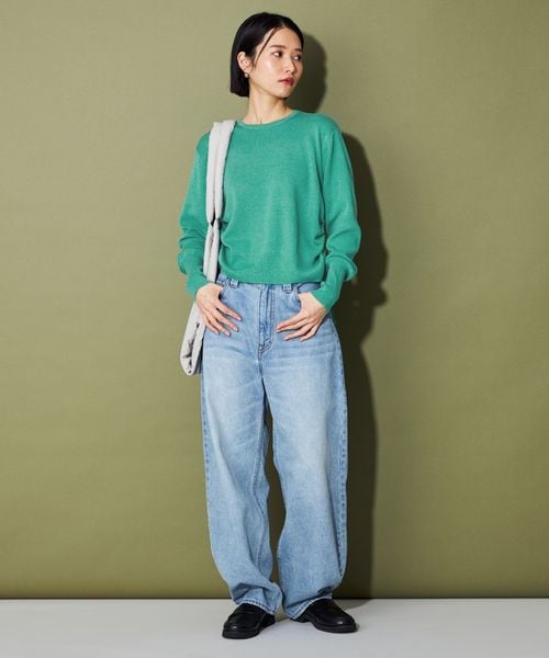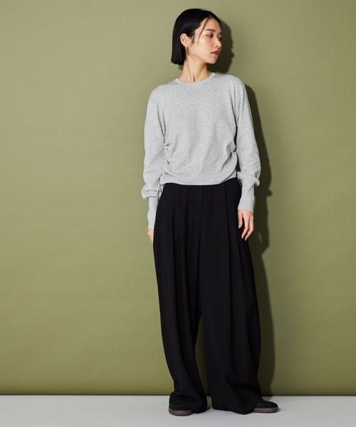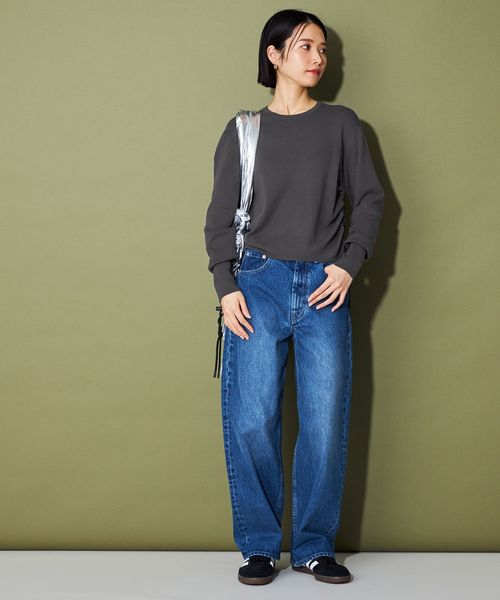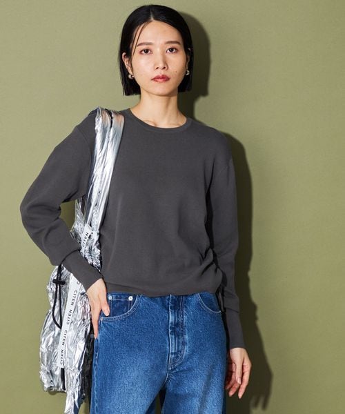 シンプルなクルーネックアイテムとして何にでも合わせやすく、ボトムを選ばず着用いただけます。