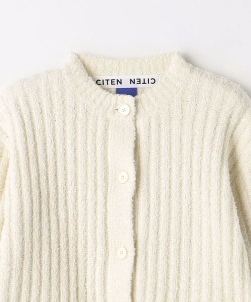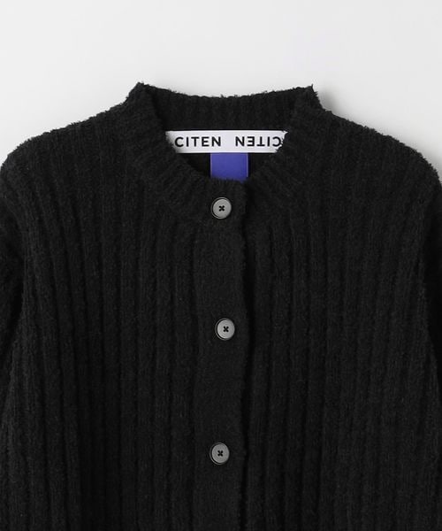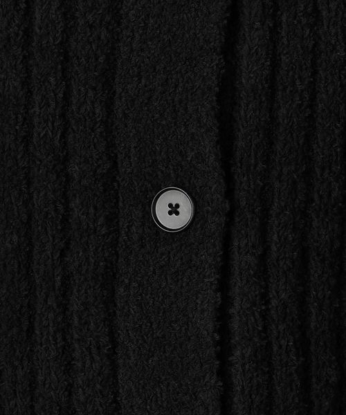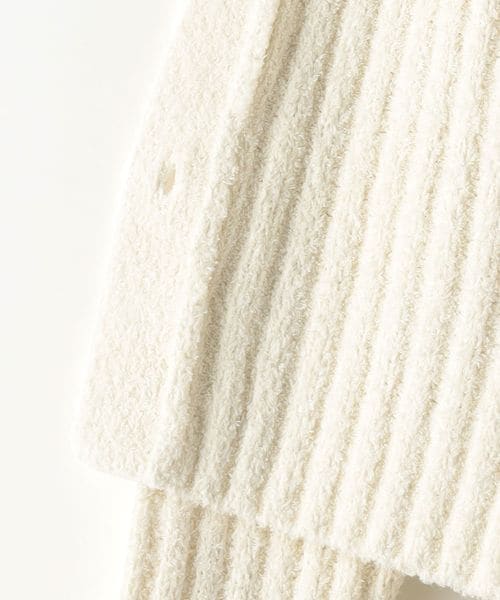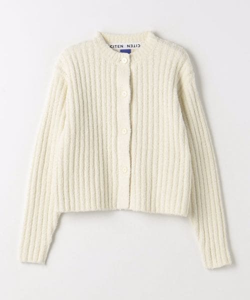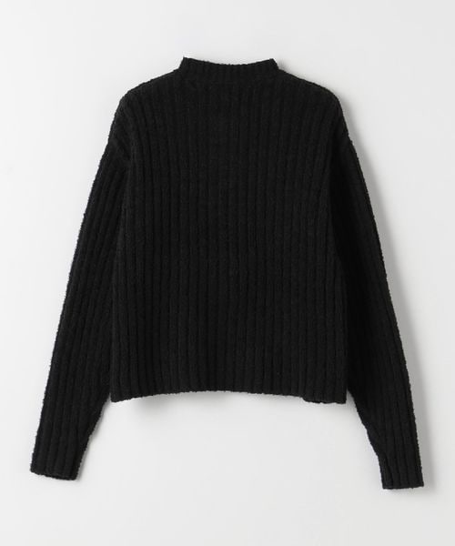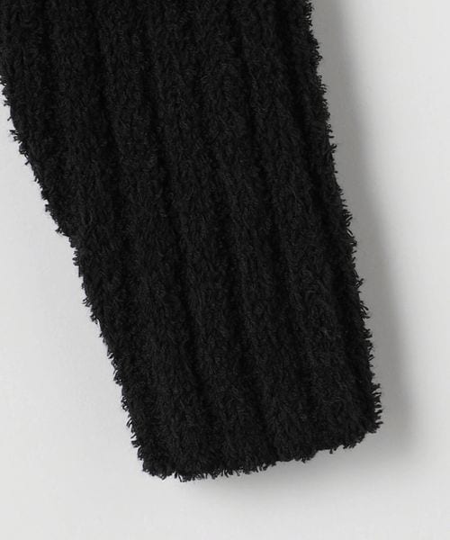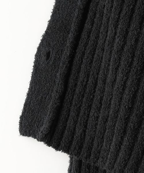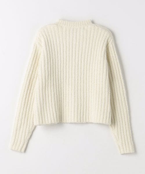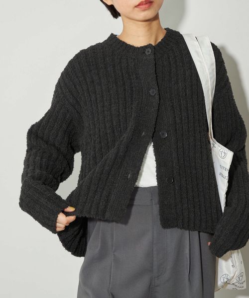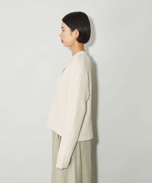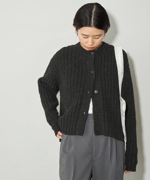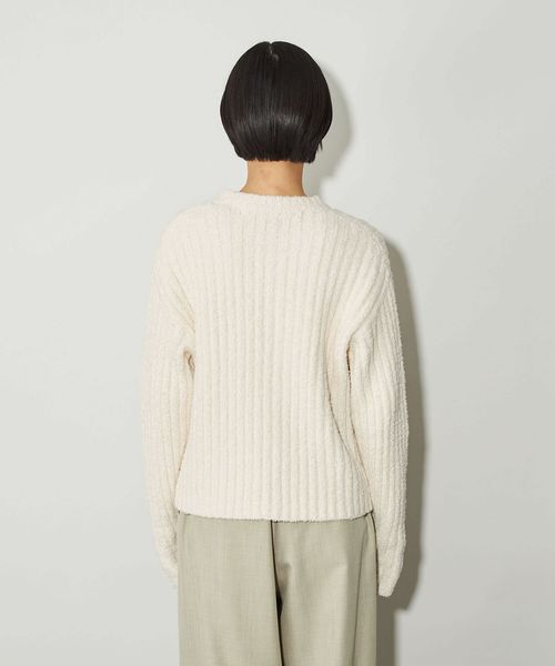 細かいループとテープ状の糸がミックスされた表情のある糸を粗いゲージで編んでおり、更にリブ編みにする事で表面感を出しました。