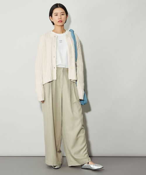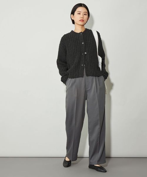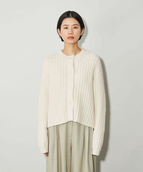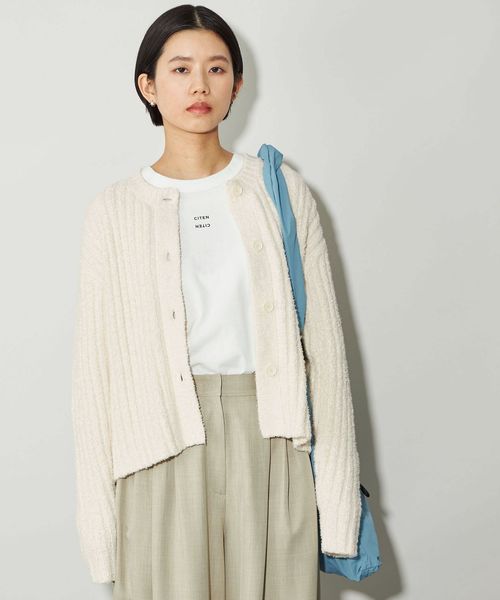 形は合わせやすいシンプルなクルーカーディガンながら、まだ肌寒い時期の羽織りにちょうど良いしっかりとした厚みがある一着。