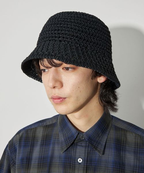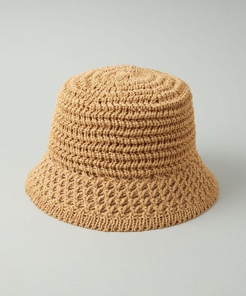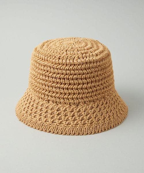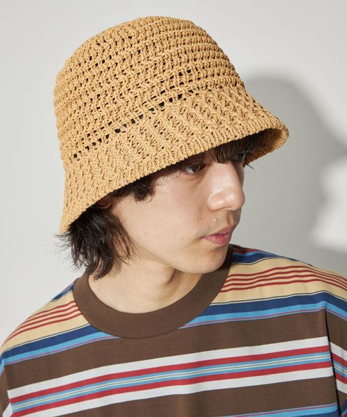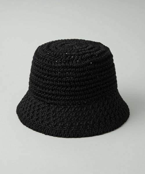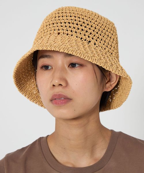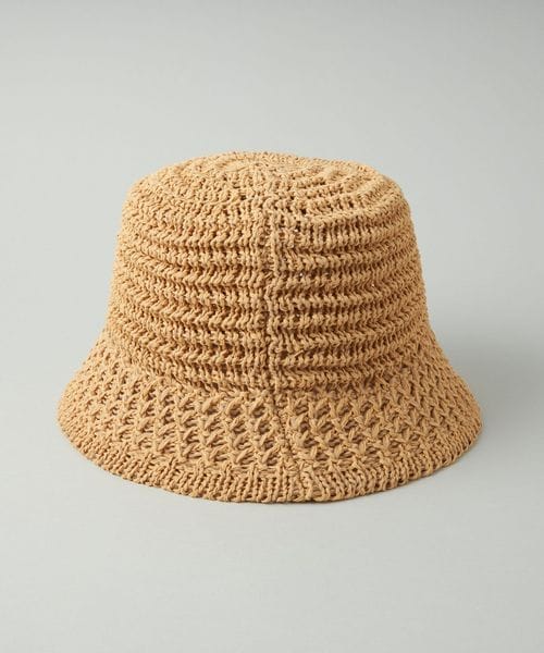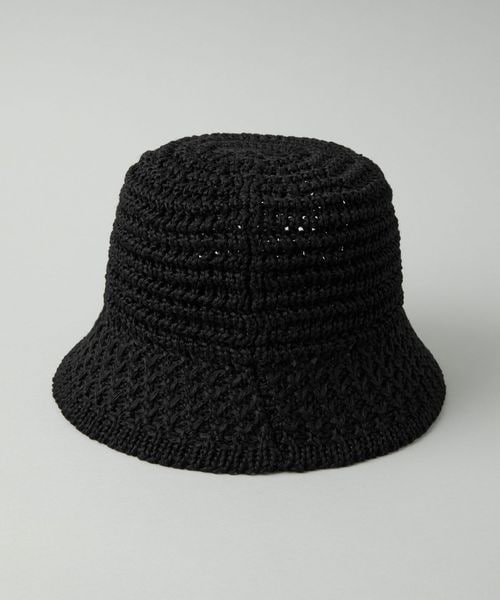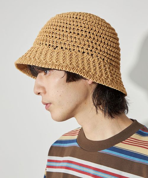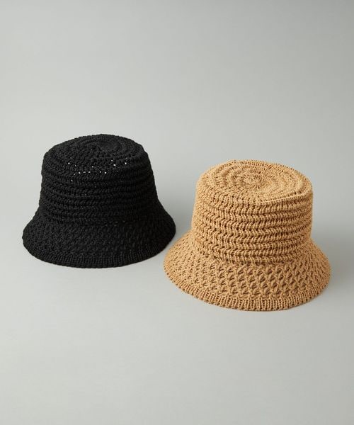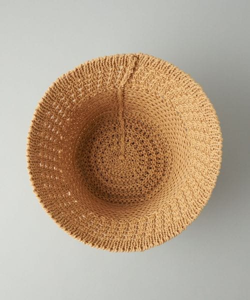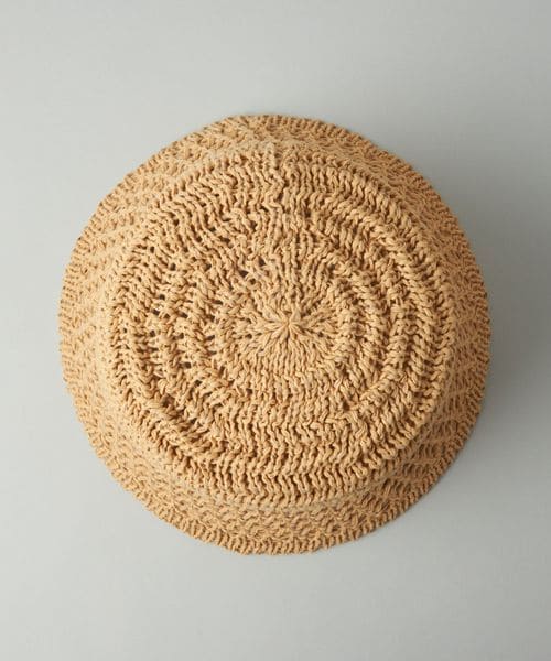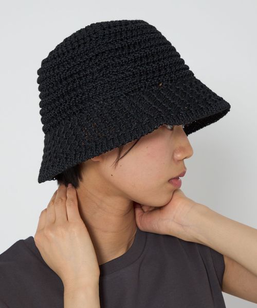 クラウンとブリム部分の編地を変えて編んだバケットハット。